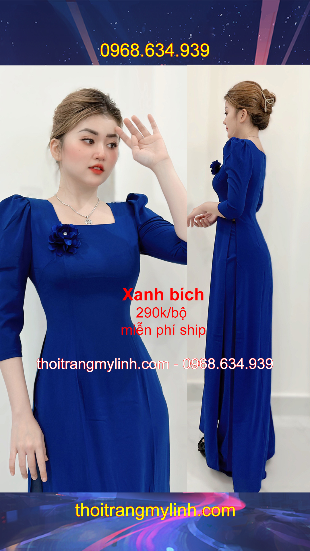 Áo cổ vuông tay lỡ, phồng màu xanh bích