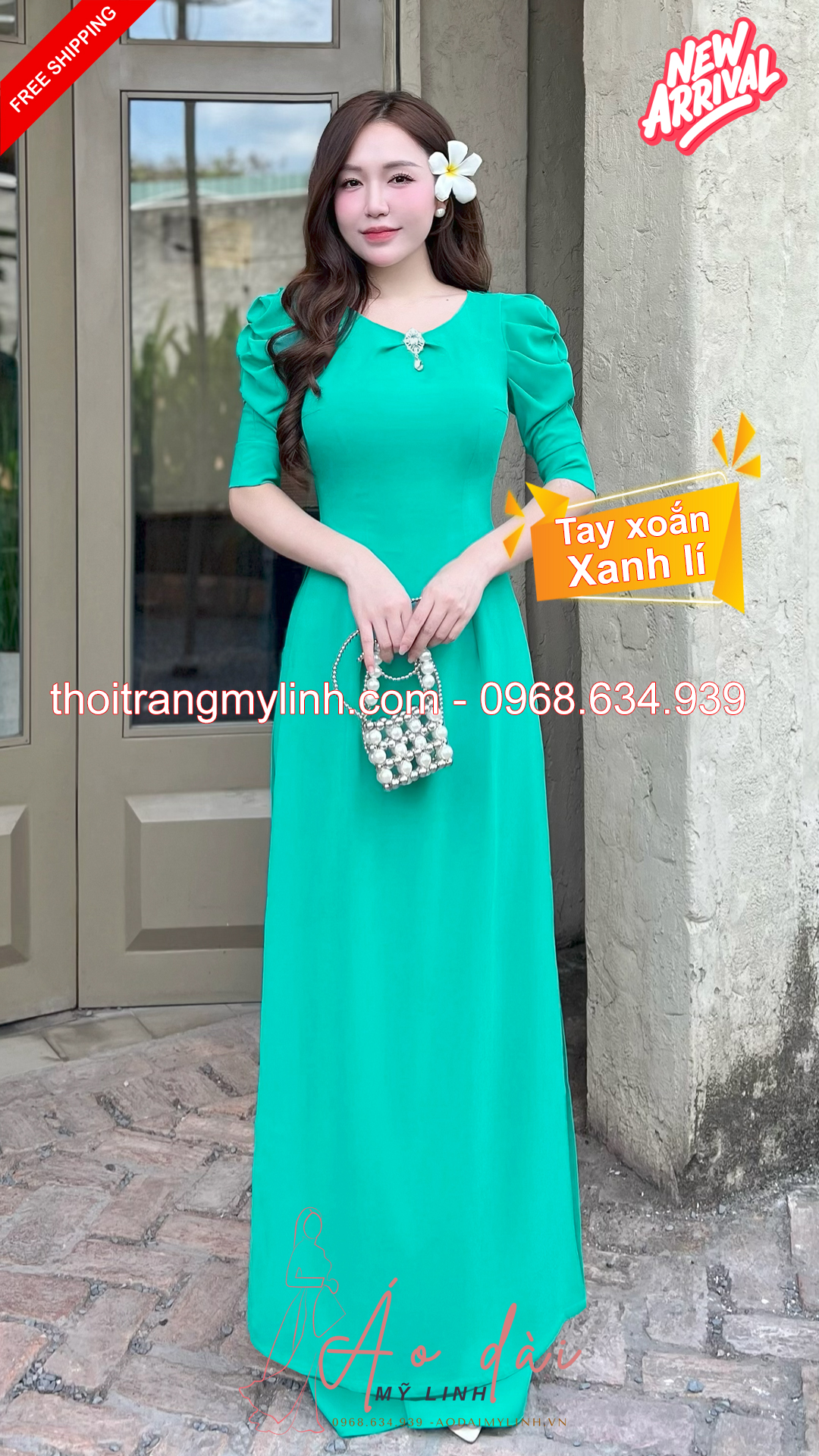 Bộ áo dài cổ tròn đính đã tay xoắn xanh lí