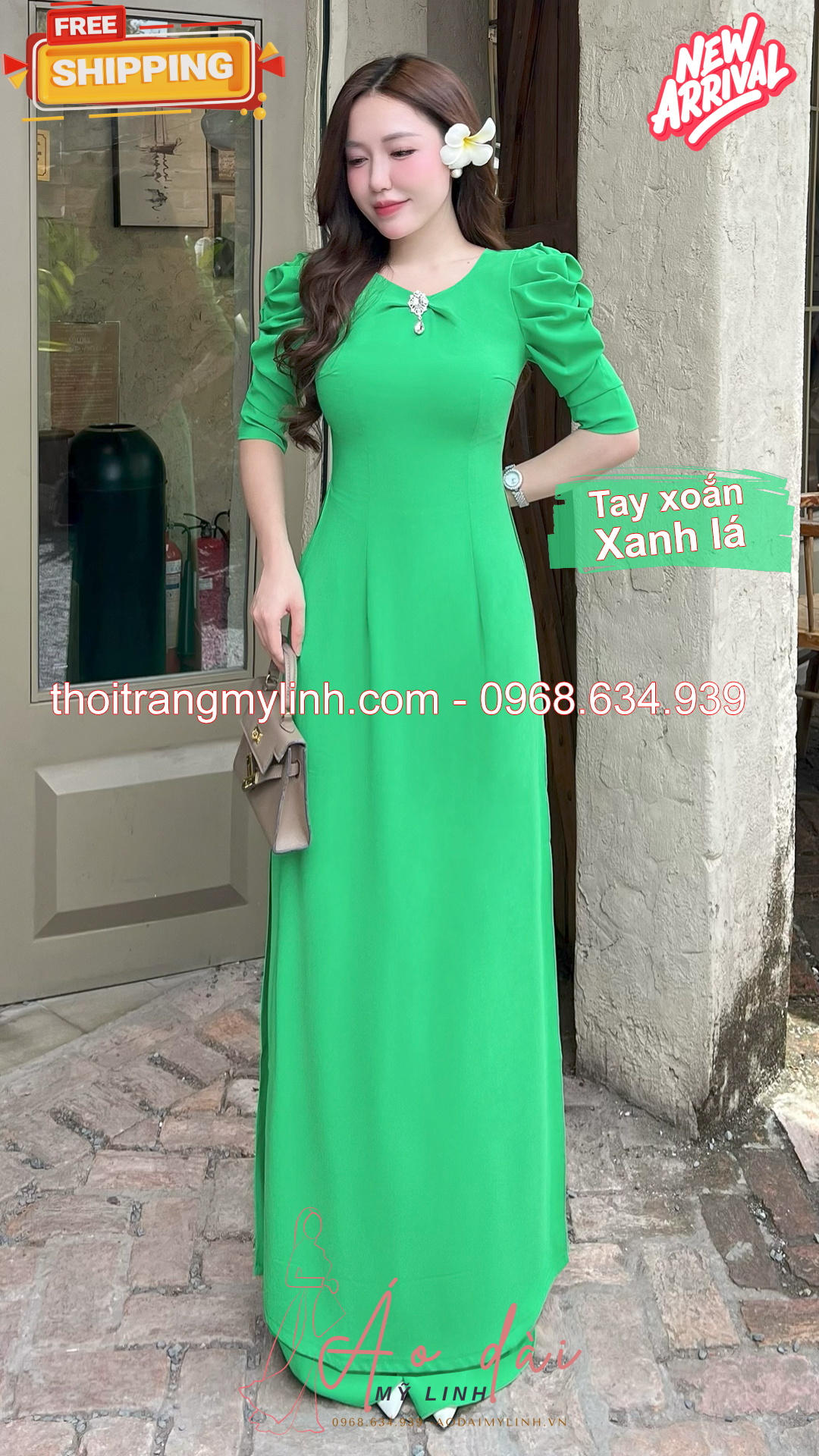 Bộ áo dài cổ tròn đính đã tay xoắn xanh lá