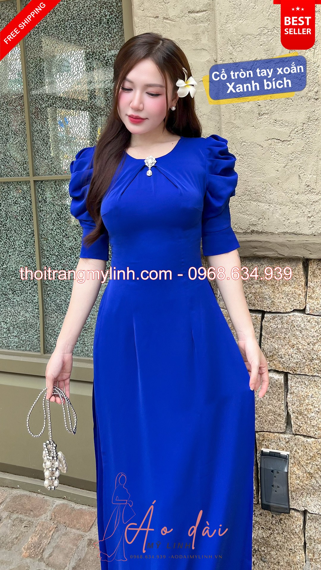Bộ áo dài cổ tròn xếp li đính đá tay xoắn xanh bích