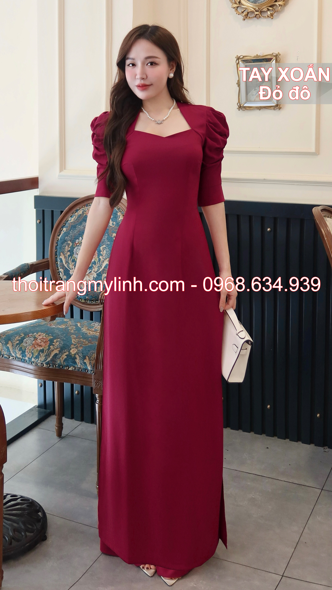 Bộ áo dài cổ nữ hoàng tay xoắn đỏ đô