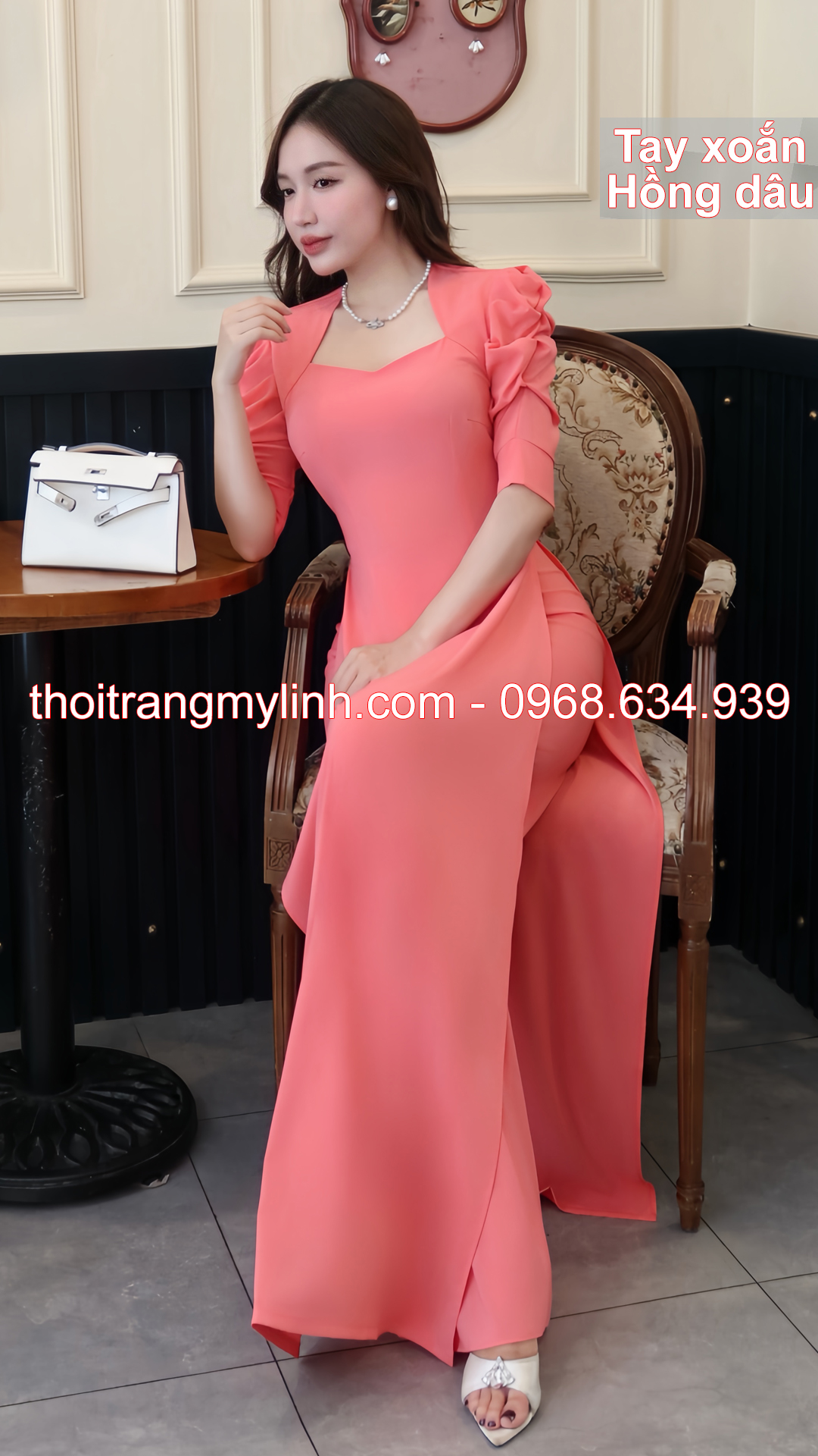Bộ áo dài cổ nữ hoàng tay xoắn hồng dâu