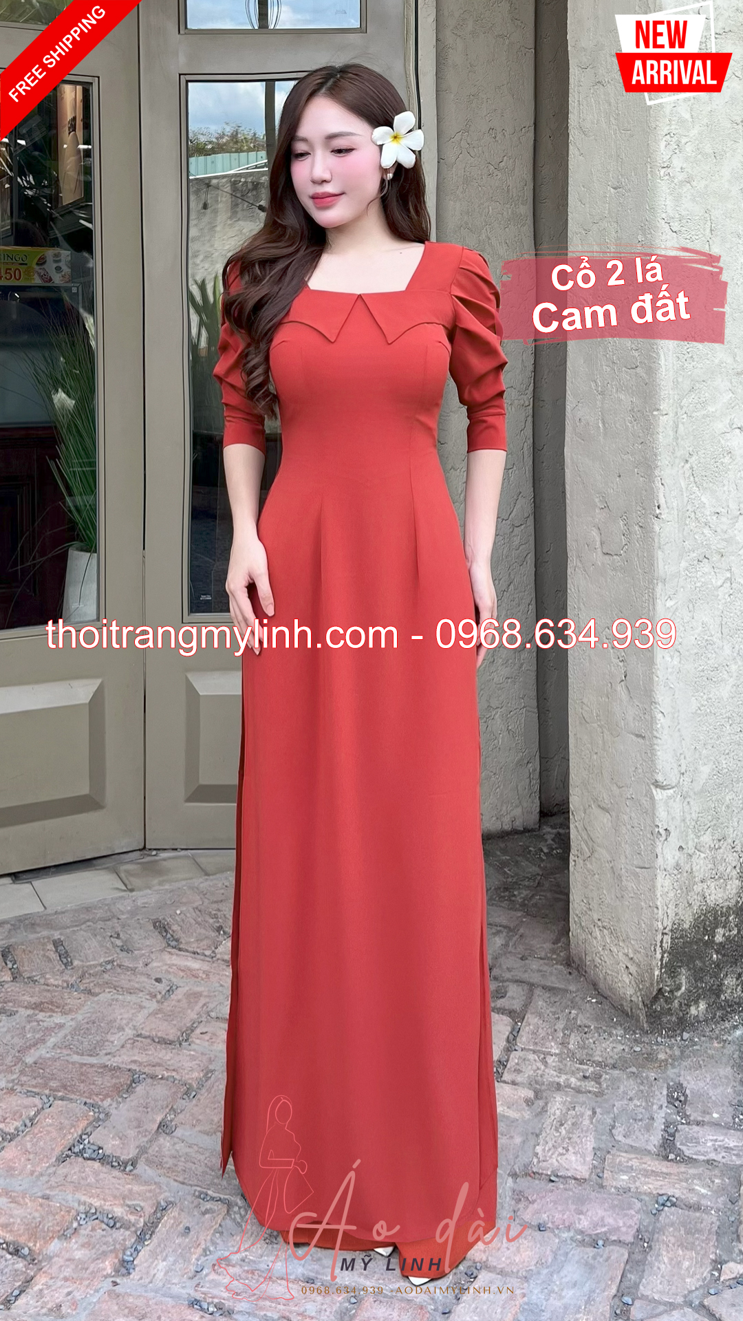 Bộ dài cổ vuông 2 lá bâu tay xếp tầng cam đất
